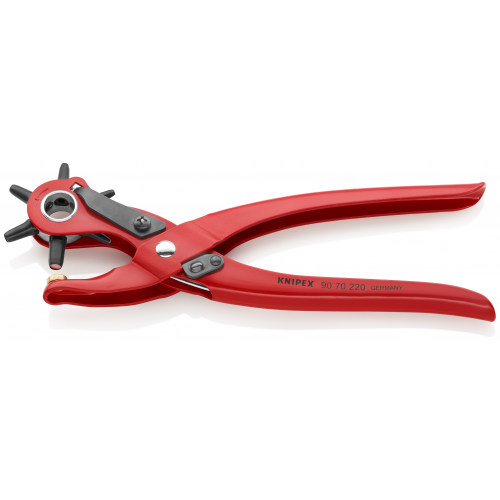 Voor het maken van gaten in leer, textiel en kunststof. Met 6 verwisselbare ponspijpjes, Ø 2,0/2,5/3,0/3,5/4,0/5,0 mm. Met openingsveer en vergrendeling. Poedergelakt voor goede bescherming tegen roest. Lichaam: uit hoogvaste staalplaat
