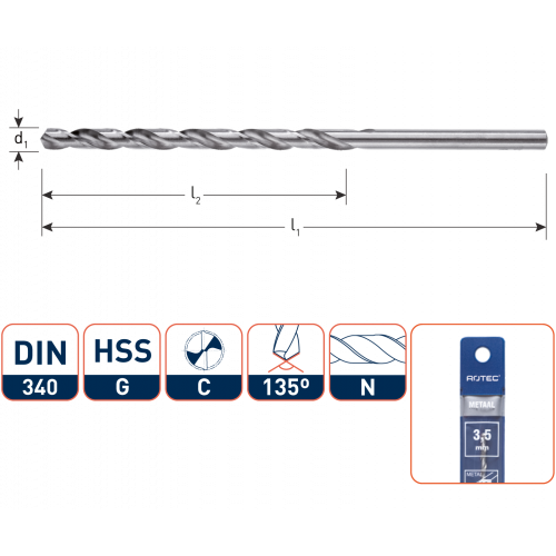 HSS-G Spiraalboor DIN 340, lang, type N, lang, geslepen uitvoering, tophoek 135°, >3,0 mm met splitpoint / kruisaanslijping (DIN 1412-C).