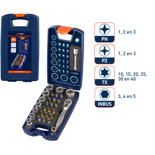 PH (Phillips) : 1x PH 1, PH 2 en PH 3. PZ (Pozi) : 1x PZ 1, 4x PZ 2, 1x PZ 3. T (Torx) : 1x T 10, T 15, T 20, T 25, T 30 en T 40. HEX (Inbus) : 1x 3, 4 en 5mm. Doppen : 1x SW 6, 7, 8, 9, 10, 11, 12, 13 en 14. 1x verlengstuk. 1x adapter. 1x ratelsleutel